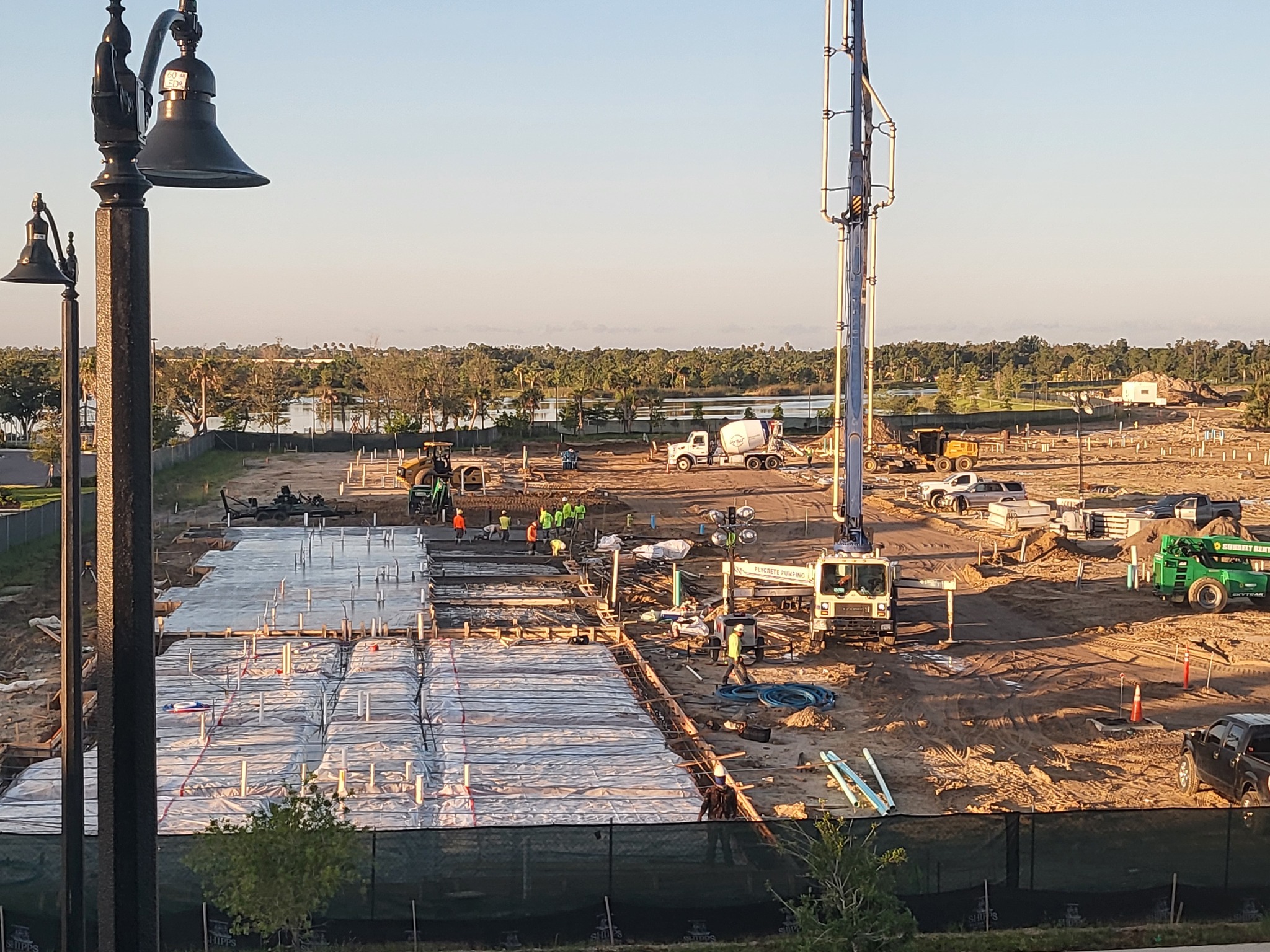 A photo captured by a local resident shows a bustling construction scene in the early am: trucks, pumps, and hard-hatted workers stretching across the sandy canvas of Village D, with the lakes and palms of Wellen Park providing a serene backdrop.
